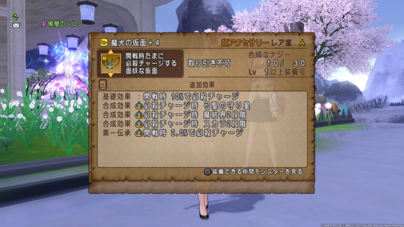 魔犬の仮面の合成効果ですが、人それぞれ好みがあると思いますが、僧侶だったら普通は聖なる祈りや早詠みの杖、そして写真のような魔結界・スカラだと思います。