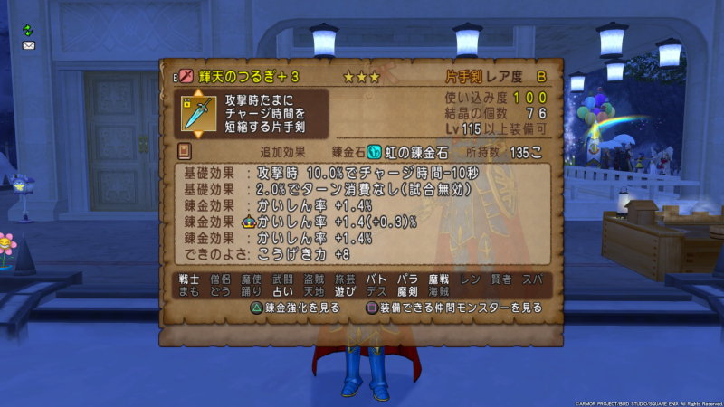 野良の緑玉を見ていると、たまにハンマーを装備している方がいますが、片手剣の輝天のつるぎを推奨します。