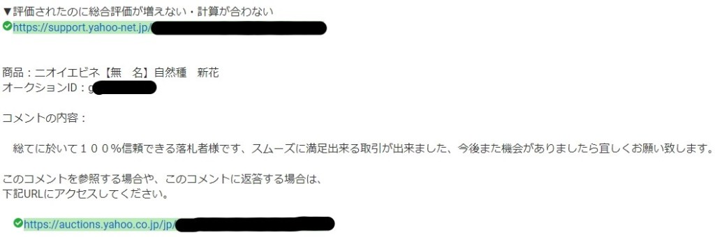 これは、数日前にヤフーオークションで落札した時の、出品者様から私への評価です。