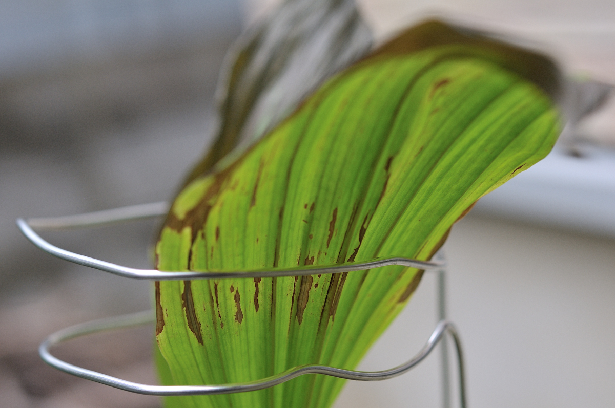 2枚の葉っぱの内、1枚は完全に葉焼けで黒くなっています。
