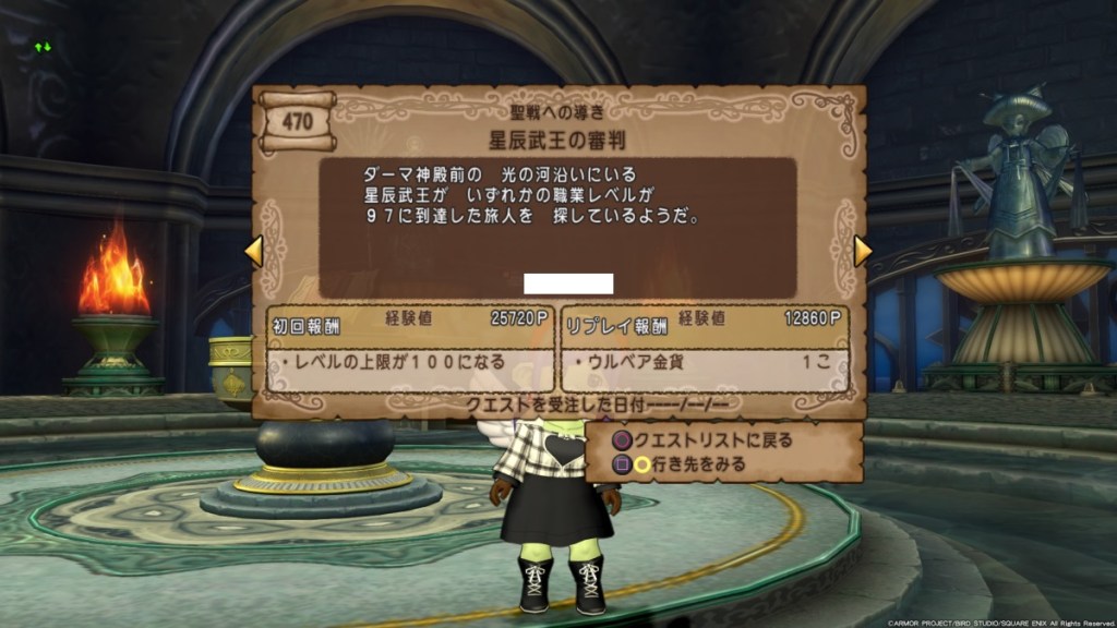 なので、バージョン2から行けるダーマ神殿のレベル上限解放クエストが受けられず、未だにレベル99以上に出来ません。