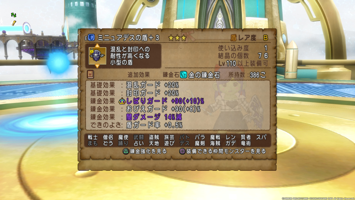 ミニュアデスの盾・基礎効果と同じ錬金効果が理論値だったので、すぐに購入。