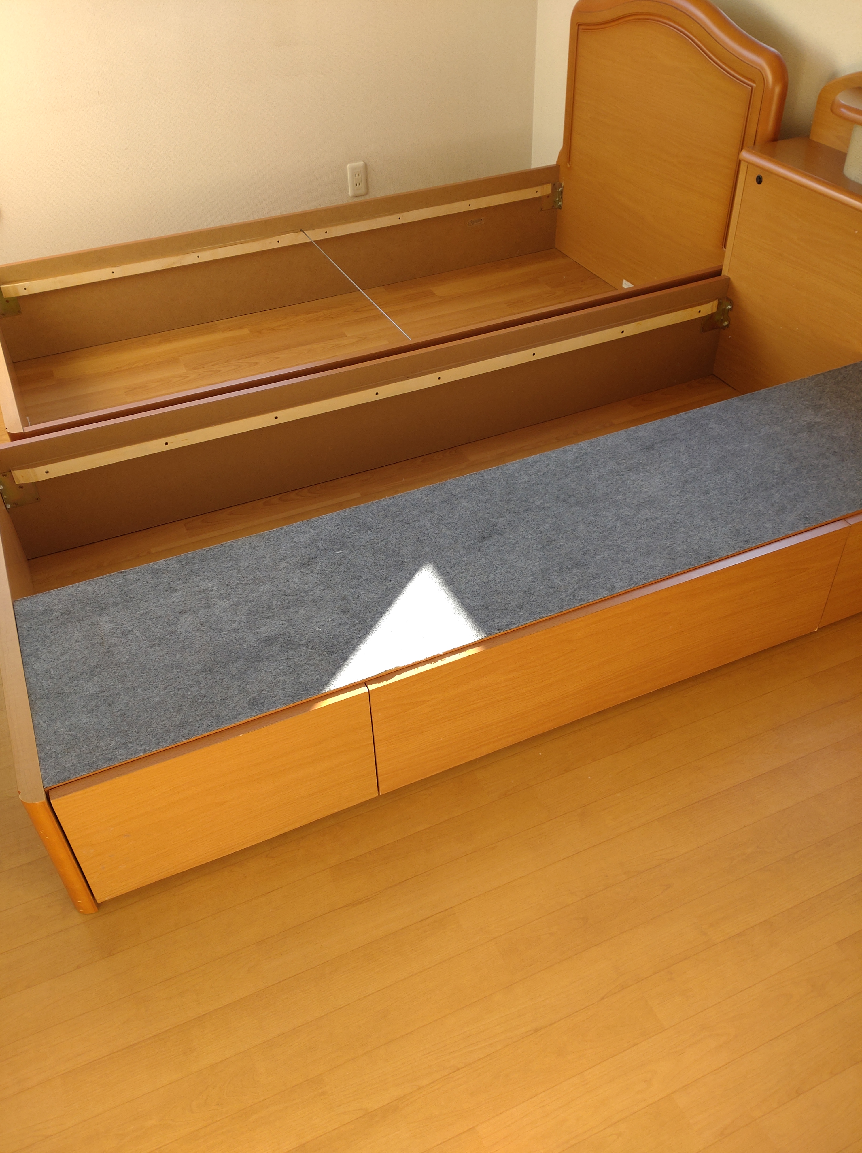 床の上には木目調の塩ビのシートを敷いているので、掃除の為にベッドを移動する時でも、傷を気にする必要がありません。