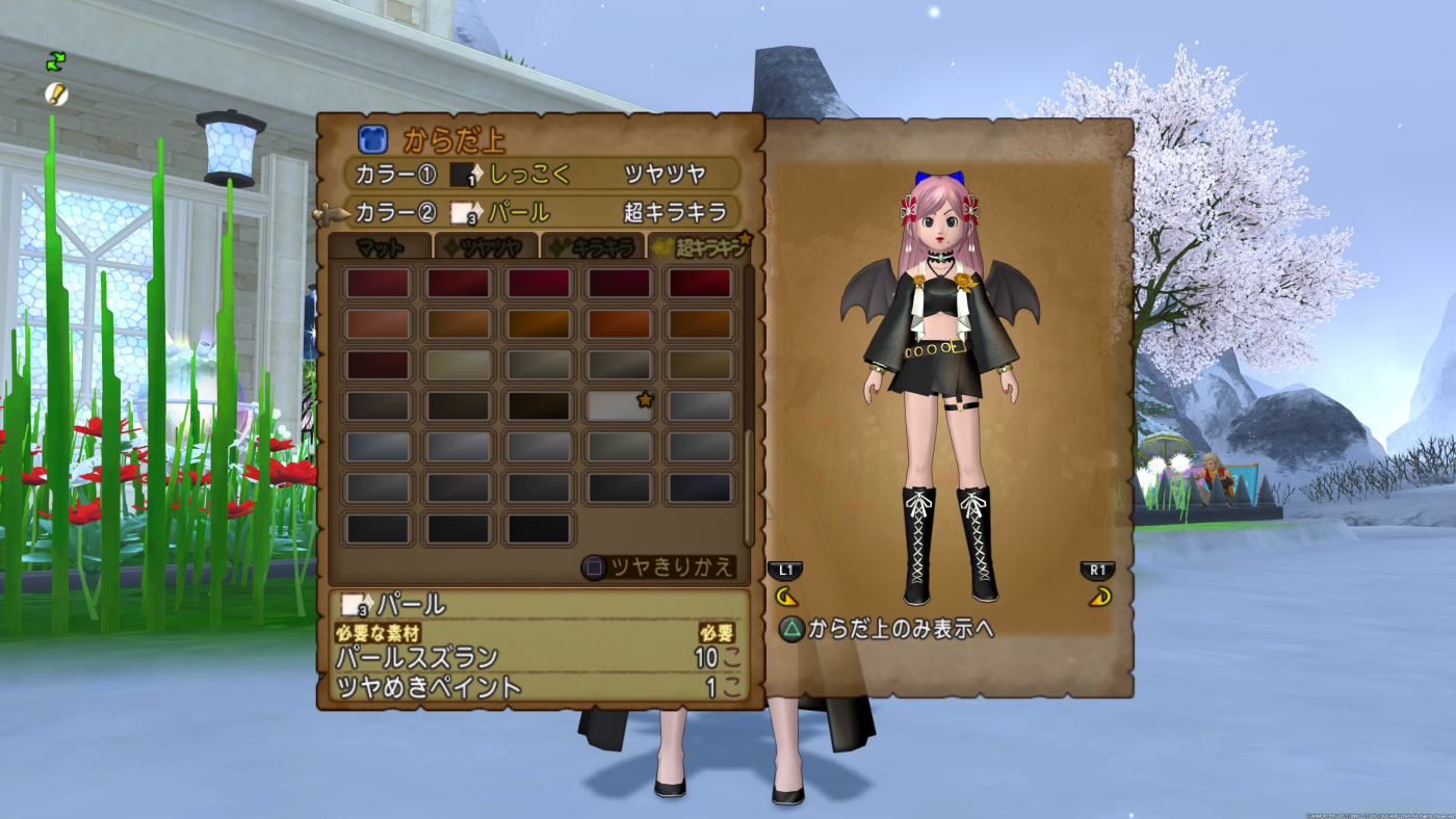 妖精郷の舞踏服上には模様が付いているので、漆黒などの濃い色はペイントを入れると、多少その模様が見られるようになります。