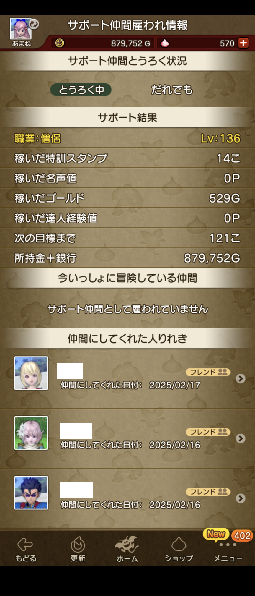 自分の僧侶が、常に上限の20人近く雇われているので自分が雇えず、わざわざ倉庫のサブキャラを育てて、他のキャラでも雇えるようにしたんですよね。