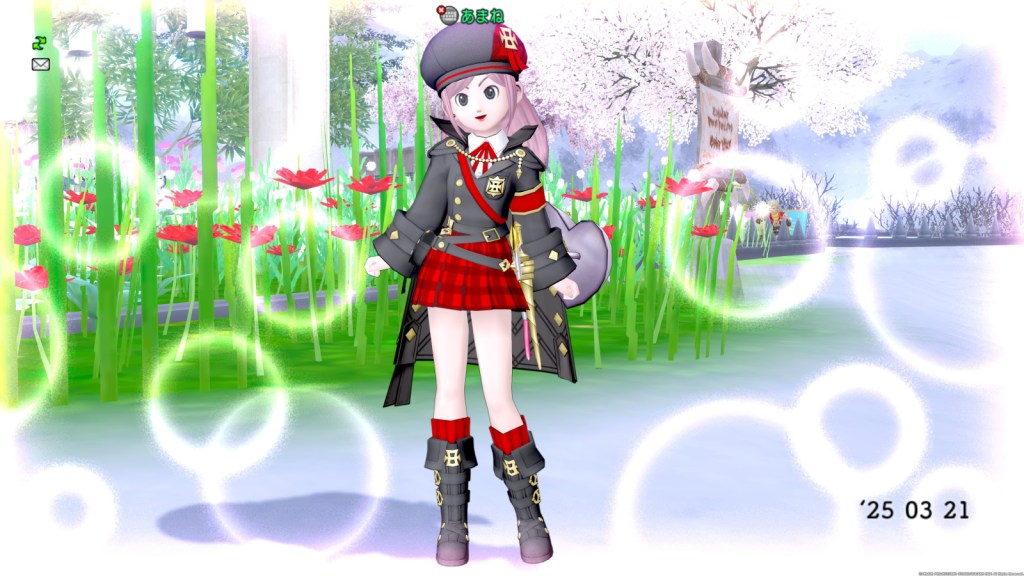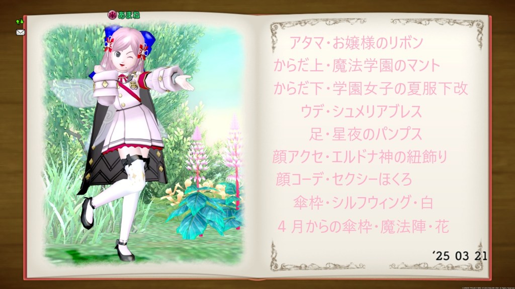 傘枠がどうしてもマントに当たるので、4月から貰えるお買い物ランク・ゴールの報酬、魔法陣・花を付ける予定です。
