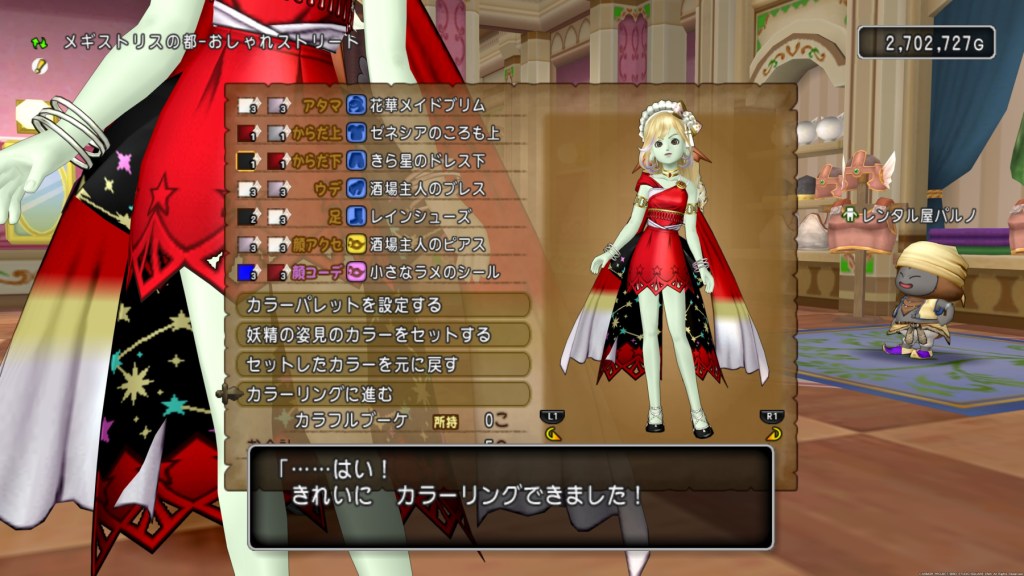 酒場主人のドレス上とヴィーラのころも下の組み合わせが良かったのですが、残念ながらサブなので、レベルが上がってなくて装備出来ず・・。