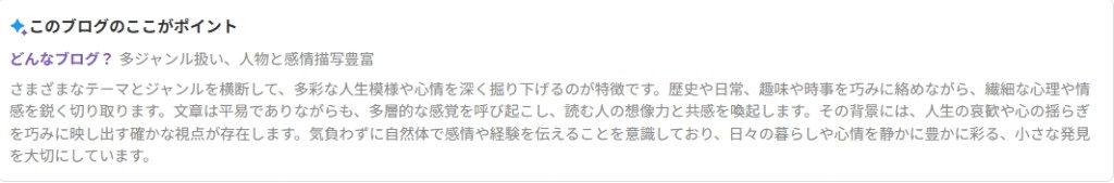 私のブログに書かれている記事をAIが調べあげて、どんなブログなのかを紹介するような感じかな。